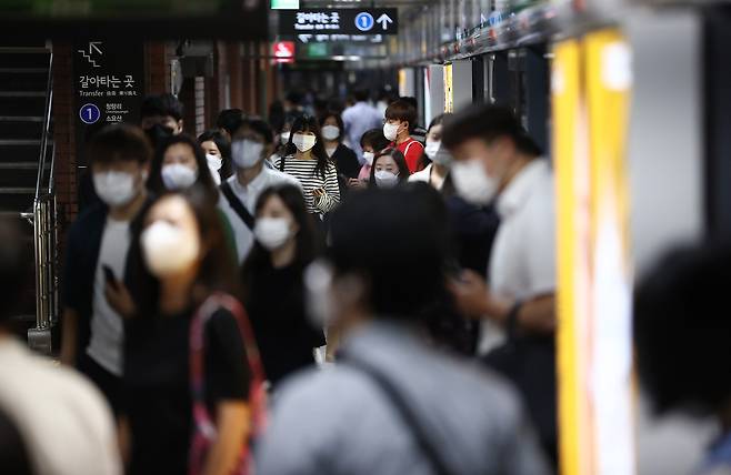 | ▲ 추석 연휴가 끝나자마자 코로나19 신규 확진자 수가 폭증한 9월 24일 오전 마스크를 쓴 출근길 시민들이 지하철 2호선 시청역을 지나고 있다. 중앙방역대책본부는 24일 0시 기준으로 신규 확진자가 2천434명 늘어 누적 29만5천132명이라고 밝혔다. |