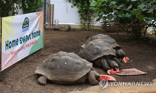 epa09510698 Giant Galapagos tortoises receive sweet water melon during an opening of a new giant tortoise enclosure at the London Zoo in London, Britain, 07 October 2021. London Zoo's Giant Galapagos tortoises have been given a new home at the London Zoo. The new giant tortoise space will be open to visitors from 09 October. EPA/ANDY RAIN