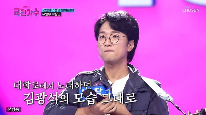 23년째 묵묵하게 포크 음악을 해 온 50살 박창근은 고 김광석의 ‘그날들’을 불렀다. 첫 소절부터 8하트를 받은 박창근은 최단시간 올하트를 받았고, 마스터들은 박창근 무대가 주는 긴 여운에 기립 박수를 보냈다. 무대를 보고 눈물을 흘린 박선주는 “음악을 처음 시작한 게 고 김광석 선배님 때문이었다. 대학로에서 오빠를 처음 봤을 때 같은 느낌을 받았다”며 “박창근 씨 노래는 뭐라고 설명하기 힘들 정도로 감동적이었다. 김광석을 기억하는 사람들에게 큰 의미가 되는 무대가 됐을 것 같다”고 평했다. (사진=TV조선 '내일은 국민가수' 방송 캡처)