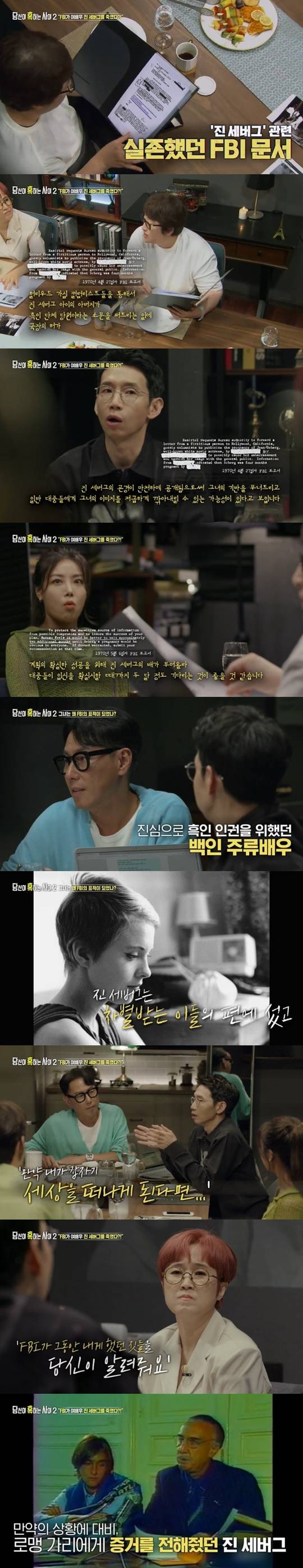 하지만 결국 진 세버그는 FBI이 의도대로 감시와 도청, 은행 계좌 추적을 당하며 편집증에 시달렸고 우울증으로 알코올과 약물에 의존해 지냈다. 로맹 가리는 진 세버그의 생전 부탁대로 FBI의 만행을 폭로한 것. 봉태규는 FBI에 의해 편집증과 우울증을 앓았던 진 세버그가 스스로 죽음을 택했다고 해도 타살이 아니었을까 의문을 제기했다. (사진=SBS ‘당신이 혹하는 사이 시즌2’ 캡처)