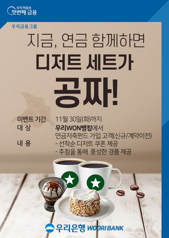 우리은행은 연말정산을 미리 준비하는 고객을 위해 '지금, 연금 함께하면 디저트 세트가 공짜' 이벤트를 다음 달 30일까지 실시한다고 8일 밝혔다.