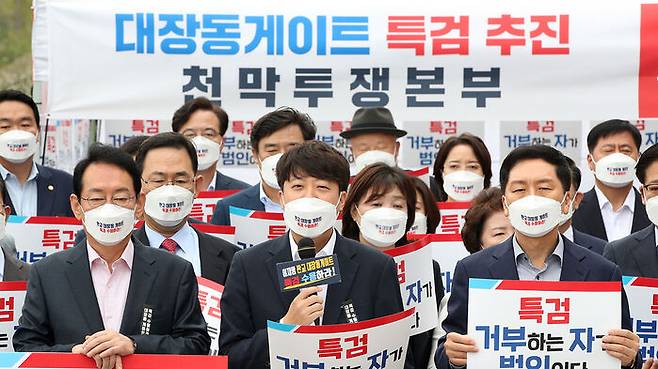 국민의힘은 국회 본관 앞에서 천막 농성에 돌입하고 여권의 대장동 의혹 특검 수용을 주장했습니다.
