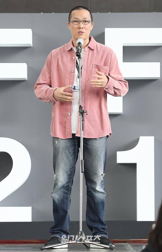 박이웅 감독이 8일 오후 부산 해운대구 영화의 전당에서 진행된 ‘제26회 부산국제영화제’(BIFF) 영화 ’불도저에 탄 소녀’ 야외무대인사에 참석해 소감을 말하고 있다.