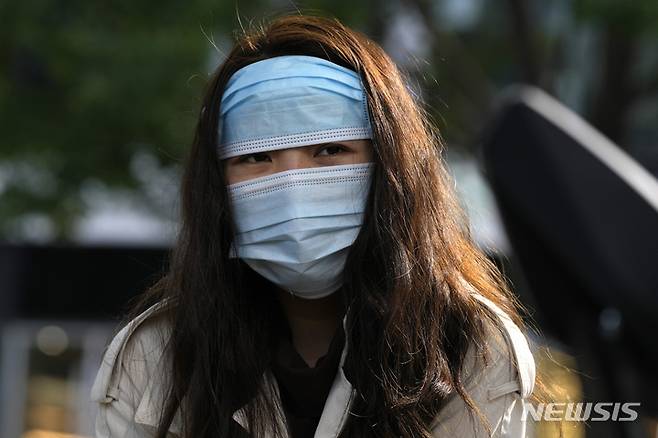 [베이징=AP/뉴시스] 8일 중국 베이징에서 얼굴에 두 개의 마스크를 쓴 여성이 거리를 지나고 있다. 2021.10.08.