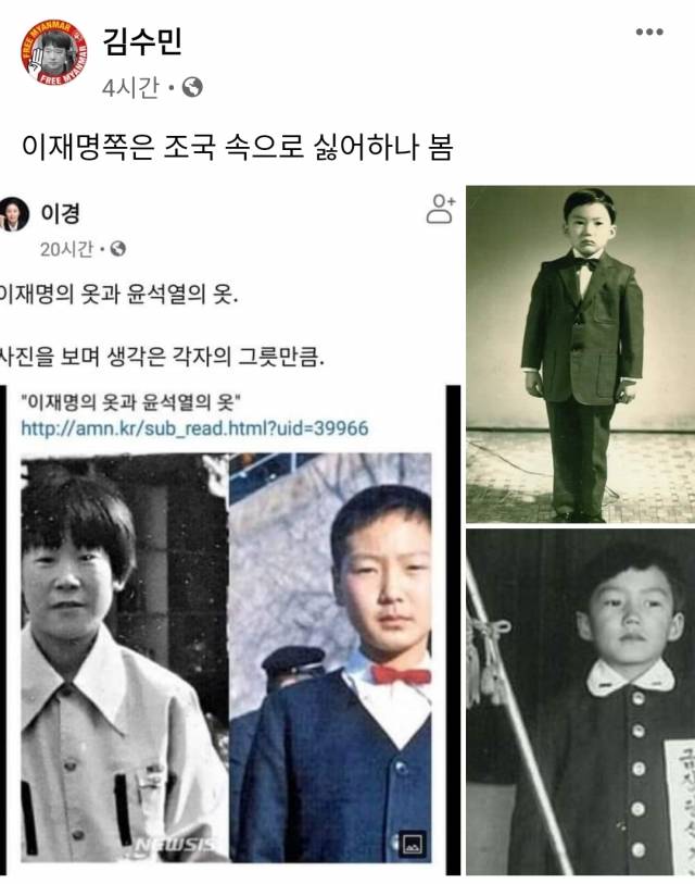 김수민 시사평론가는 8일 페이스북에 조 전 정관의 어린 시절 사진을 올리며 “이재명 쪽은 조국(을) 속으로 싫어하나 보다”라고 적었다.