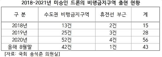10일 국방부가 국회 국토교통위원회 송석준 의원(국민의힘)에게 제출한 자료에 따르면 전국의 드론 비행금지구역 중 수도권 비행금지구역과 휴전선 부근에서 승인을 받지 않고 드론을 띄운 경우는 2018년 15건에서 지난해는 56건으로 급증했다.