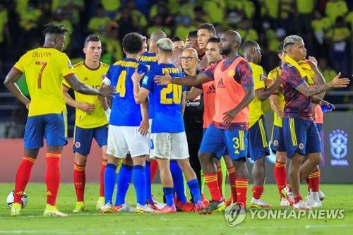 epa09517766 Colombia's and Brazil's players greet each other at the conclusion of the CONMEBOL World Cup Qatar 2022 qualifier soccer match between Colombia and Brazil at the Metropolitano Stadium in Barranquilla, Colombia, 10 October 2021. EPA/RICARDO MALDONADO ROZO