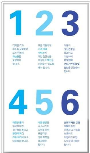 코로나19는 앞으로 수년 동안 아동에게 파괴적인 영향을 미칠 것이다. 현재까지 세계 각국 정부는 코로나 극복과 경제 부양을 위해 수십억 달러를 투입해왔다. 172개 유엔 회원국에 각국의 아동을 보호하겠다는 강력한 다짐을 촉구하는 6가지 긴급조치는 아동의 권리를 보호하고 더 나은 미래를 구상하기 위한 구체적인 행동 지침이다. 한국 정부 역시 아동과 청소년 보호를 위해 추진해야 할 중요한 정책이다.