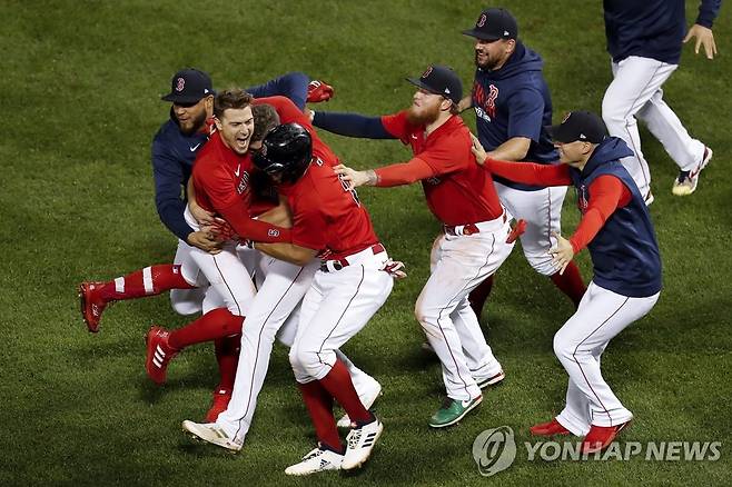 이날 보스턴은 9회 말 1사 후에 터진 엔리케 에르난데스(왼쪽 두 번째)의 희생플라이로 6-5로 승리, 3승 1패를 기록하며 아메리칸리그 챔피언십시리즈(ALCS·7전 4승제)에 진출했다.