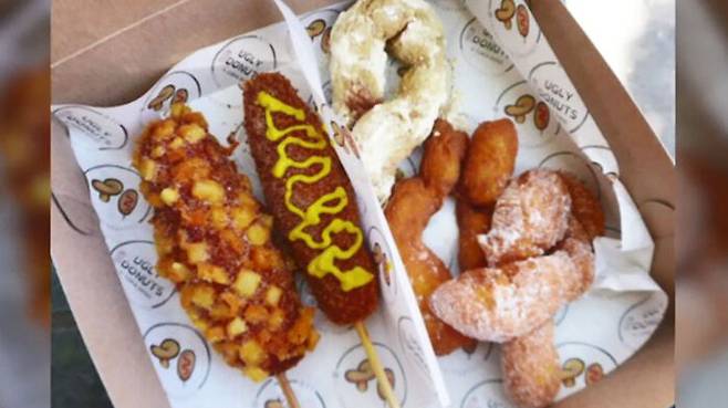 한국식 핫도그의 인기 비결은 쌀가루를 사용해 쫄깃한 식감을 주는 반죽과 감자를 입히거나 라면을 뿌리는 등 다양하게 즐길 수 있기 때문이라고 합니다.