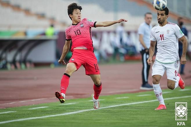 [서울=뉴시스] 조수정 기자 = 12일 오후(한국시간) 이란 아자디 스타디움에서 열린 2022 카타르월드컵 아시아최종예선 A조 대한민국 축구 국가대표팀 벤투호와 이란 경기, 이재성이 볼다툼 하고 있다. (사진=대한축구협회 제공) 2021.10.12. photo@newsis.com *재판매 및 DB 금지