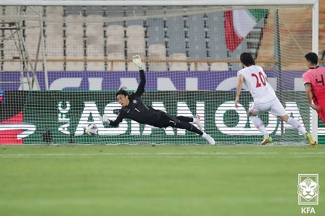 [서울=뉴시스] 조수정 기자 = 12일 오후(한국시간) 이란 아자디 스타디움에서 열린 2022 카타르월드컵 아시아최종예선 A조 대한민국 축구 국가대표팀 벤투호와 이란 경기, 대한민국 골키퍼 김승규가 이란의 볼을 막아내고 있다. (사진=대한축구협회 제공) 2021.10.12. photo@newsis.com *재판매 및 DB 금지