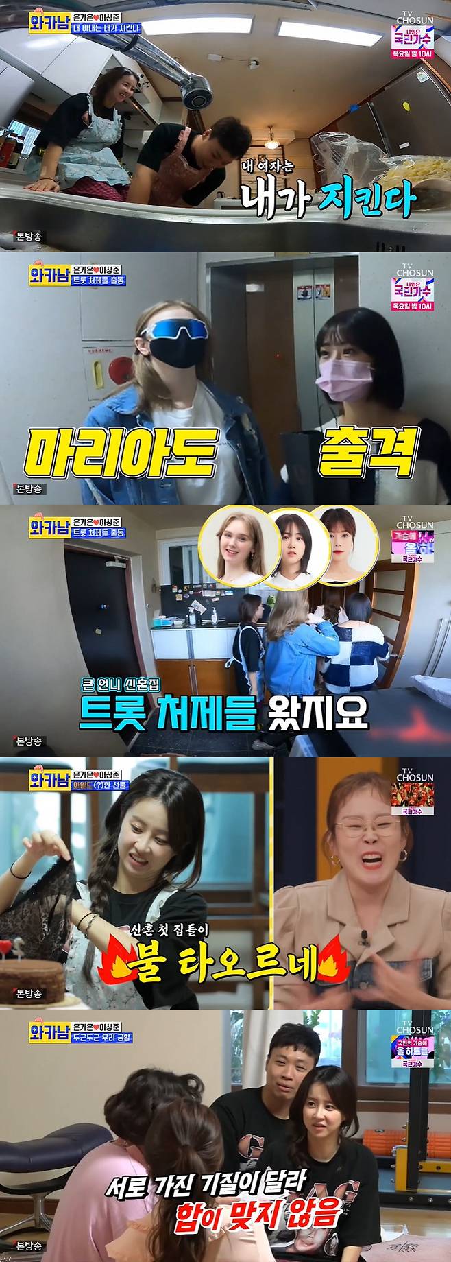 집들이 초대 멤버는 양지은, 마리아 등 '미스트롯2' 처제들과 개그우먼 신기루. 마리아는 두 사람을 위해 과감한 커플 속옷 세트를 선물했다. 이에 은가은은 "오빠는 이런 거 말고 일본 스타일 좋아한다"고 너스레를 떨었다. 이상준이 속옷 인증을 하러 간 사이 신기루는 이상준 칭찬을 했다. 신기루는 "볼수록 애가 괜찮다. 얼굴 빼고 스윗하다"며 "요새 30분씩 통화하는데 가은 씨 얘기 많이 한다"고 말해 은가은을 흐뭇하게 했다.