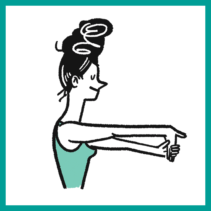 ① 정면을 보고 양팔을 앞으로 나란히 뻗어 왼손으로 오른쪽 손가락을 몸 안쪽으로 잡아당겨 팔 근육을 늘린다.