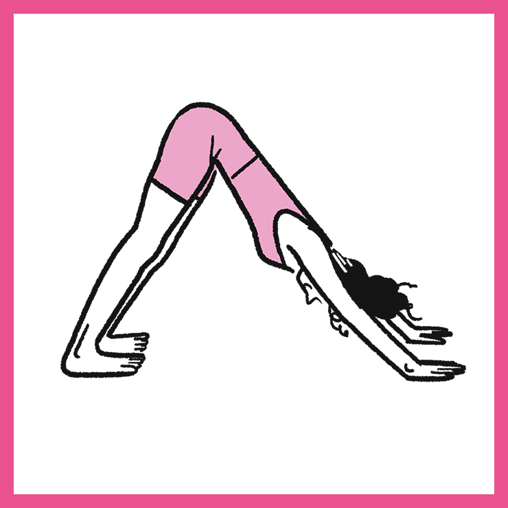 ① 양 발바닥과 손바닥을 바닥에 대고 엎드린 자세에서 준비. 이때 하체 뒤쪽 근육의 땅김이 최대치라 느껴질 만큼 엉덩이를 위로 높게 들어 몸 전체를 삼각형으로 만든다.