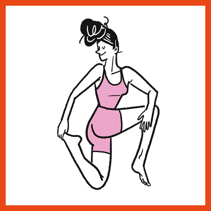 ② 숨을 내쉬며 왼쪽 무릎을 굽히는데, 반대쪽 다리의 허벅지와 종아리 뒤쪽 근육의 땅김을 느끼며 동작을 시행하는 게 핵심.