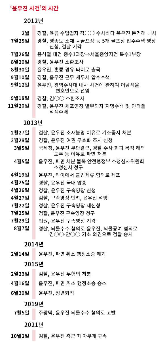 서울경찰청 광역수사대는 2012년 2월 말 윤우진 용산세무서장과 육류 수입업체 ㅌ 트레이드 김 아무개 대표 사이 수상한 돈거래를 포착했다. 3년 뒤인 2015년 2월23일, 서울중앙지검 형사3부는 윤우진씨를 무혐의 처분했다. 그사이 ‘상식적으로 납득할 수 없는’ 일이 잇달아 벌어졌다. 경찰 수사를 피해 도피성 해외 출국을 감행한 윤우진씨가 인터폴 수배로 국내에 강제송환되었다. 경찰이 구속영장을 신청했지만 검찰이 반려해 풀어줬다. 검찰로부터 최종 무혐의 처분을 받은 윤우진씨는 행정소송을 통해 국세청에 복직해 정년퇴직을 했다. 1948년 정부 수립 이후 고위직 공무원이 수사를 받다가 해외로 도주해놓고도 구속되지 않았을뿐더러 검찰의 무혐의 처분으로 복직해서 정년퇴직까지 마친 첫 사례였다(‘윤우진 통하면 모든 게 해결된다’ 기사 참조).