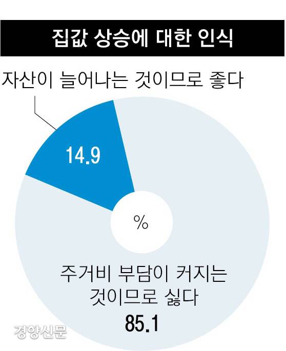 최은영 한국도시연구소장은 “주택 소유자들도 내 집보다 훨씬 더 많이 오른 다른 집을 보면서 박탈감을 느껴 주택가격 안정을 희망한 것으로 추정된다”며 “주택가격이 인상되면 언젠가 전·월세값도 오른다고 인식하기에 세입자 쪽에서 집값 상승 부정 여론이 더 높게 나타났다”고 말했다.