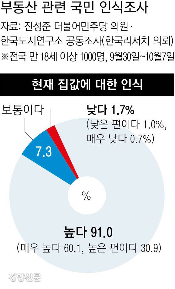 12일 국회 국토교통위원회 진성준 더불어민주당 의원과 한국도시연구소가 한국리서치에 의뢰해 전국 만 18세 이상 1000명을 대상으로 조사한 ‘부동산 관련 국민 인식조사’를 보면, 현재 집값이 높다고 본다는 응답은 91.0%로 나타났다. 집값이 높다는 응답 중 ‘매우 높다’는 60.1%, ‘높은 편’이라는 응답은 30.9%였다.