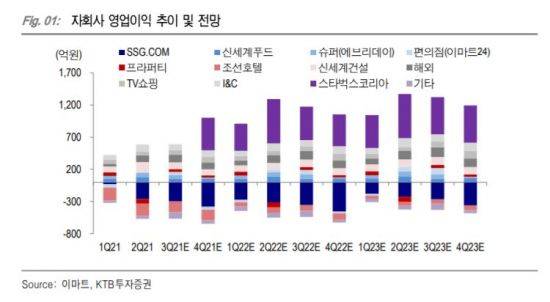 이마트의 내년 연간 주당순이익(EPS)는 1만5581원으로, 가양점 매각 차익을 제외하면 올해보다 9400원이 늘어날 전망이다. 스타벅스코리아 지분 확대와 자회사 실적 개선이 이뤄질 것으로 기대된다. 내년 자회사 영업이익은 전년대비 353.5% 증가한 2265억원, 스타벅스코리아 영업이익은 2125억원으로 전망된다. 쓱닷컴의 영업손실은 1408억원으로 전년대비 432억원 증가할 것으로 추정된다. 이마트24가 흑자전환해 영업이익 45억원을 반영한 결과다.