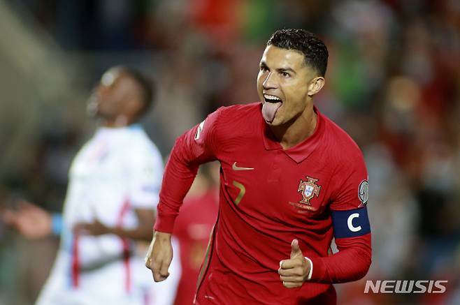 [알가르브=AP/뉴시스] 크리스티아누 호날두가 12일(현지시간) 포르투갈 알가르브에서 열린 2022 카타르 월드컵 유럽 예선 A조 6차전 룩셈부르크와의 경기 전반 10분 PK로 두 번째 골을 넣고 기뻐하고 있다. 포르투갈은 호날두의 해트트릭을 앞세워 룩셈부르크를 5-0으로 꺾고 조 2위를 기록 중이다. 2021.10.13.