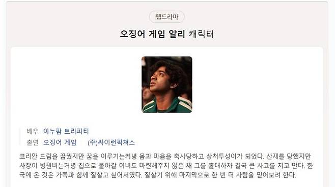 "코리안 드림을 꿈꿨지만 꿈을 이루기는커녕 몸과 마음을 혹사당하고 상처투성이가 되었다. 산재를 당했지만 사장이 병원비는커녕 집으로 돌아갈 여비도 마련해주지 않은 채 그를 홀대하자 결국 큰 사고를 치고 만다." - '오징어 게임' 알리 배역 소개 中