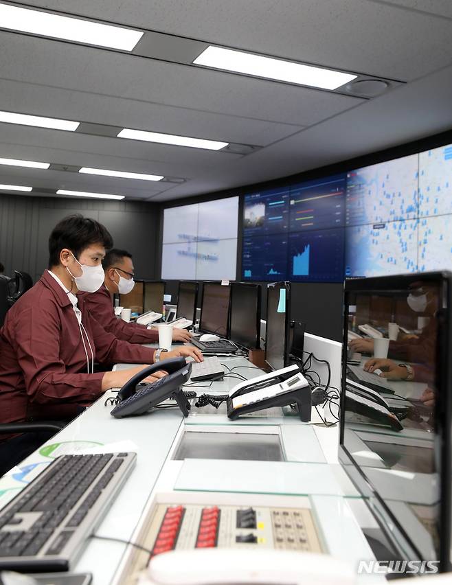[성남=뉴시스] 추상철 기자 = 13일 오전 경기 성남시 분당구 KT 분당 사옥 내 KT에스테이트 스마트통합관제센터에서 직원들이 '스마트통합관제플랫폼을 통한 에너지 절감 및 안정적인 건물 관리' 및 'KT Cloud를 활용한 스마트통합관제' 시연을 하고 있다. 2021.10.13. scchoo@newsis.com