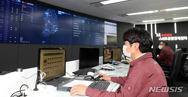 [성남=뉴시스] 추상철 기자 = 13일 오전 경기 성남시 분당구 KT 분당 사옥 내 KT에스테이트 스마트통합관제센터에서 직원들이 '스마트통합관제플랫폼을 통한 에너지 절감 및 안정적인 건물 관리' 및 'KT Cloud를 활용한 스마트통합관제' 시연을 하고 있다. 2021.10.13. scchoo@newsis.com