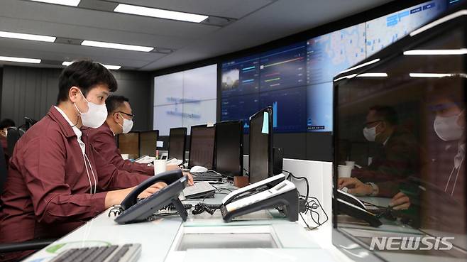 [성남=뉴시스] 추상철 기자 = 13일 오전 경기 성남시 분당구 KT 분당 사옥 내 KT에스테이트 스마트통합관제센터에서 직원들이 '스마트통합관제플랫폼을 통한 에너지 절감 및 안정적인 건물 관리' 및 'KT Cloud를 활용한 스마트통합관제' 시연을 하고 있다. 2021.10.13. scchoo@newsis.com