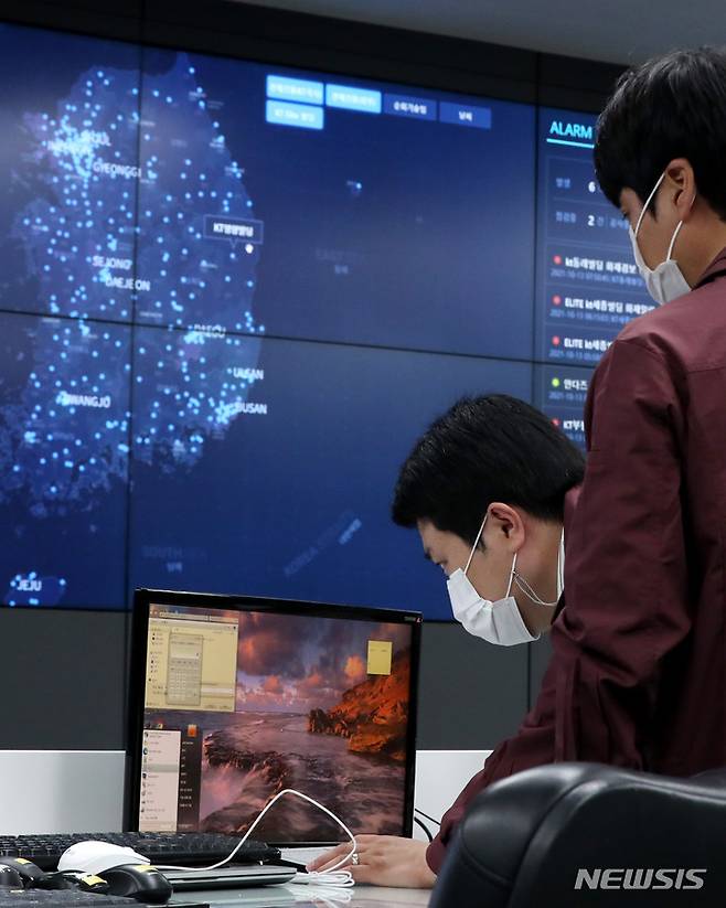 [성남=뉴시스] 추상철 기자 = 13일 오전 경기 성남시 분당구 KT 분당 사옥 내 KT에스테이트 스마트통합관제센터에서 직원들이 '스마트통합관제플랫폼을 통한 에너지 절감 및 안정적인 건물 관리' 및 'KT Cloud를 활용한 스마트통합관제' 시연을 하고 있다. 2021.10.13. scchoo@newsis.com
