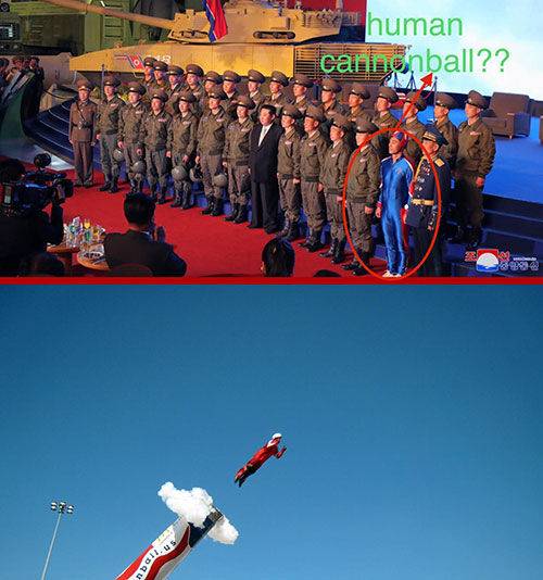 이 남성이 (존재하지 않는 기관인) 북한 우주군 대원이라거나, 미국 영화 마블 시리즈의 등장인물 '캡틴 아메리카'에서 따와 '캡틴 북한'이라고 하는 글도 달렸습니다.