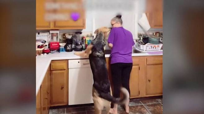 미국에 사는 티나 씨가 설거지를 하고 있는데 엎드려 있던 반려견 맥스가 갑자기 일어나 달려듭니다.