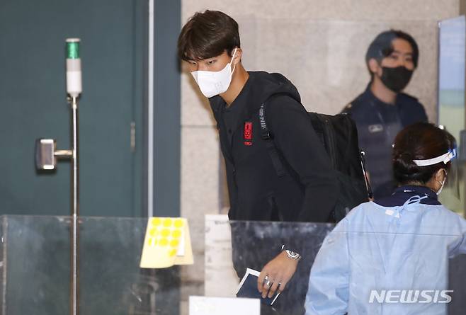 [인천공항=뉴시스] 정병혁 기자 = 2022 카타르 월드컵 아시아 지역 최종 예선 A조 4차전 이란과의 원정경기를 무승부로 마친 대한민국 축구대표팀 송범근이 13일 오후 인천국제공항 제1여객터미널을 통해 귀국하고 있다. 2021.10.13. jhope@newsis.com