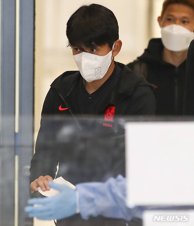 [인천공항=뉴시스] 정병혁 기자 = 2022 카타르 월드컵 아시아 지역 최종 예선 A조 4차전 이란과의 원정경기를 무승부로 마친 대한민국 축구대표팀 홍철이 13일 오후 인천국제공항 제1여객터미널을 통해 귀국하고 있다. 2021.10.13. jhope@newsis.com