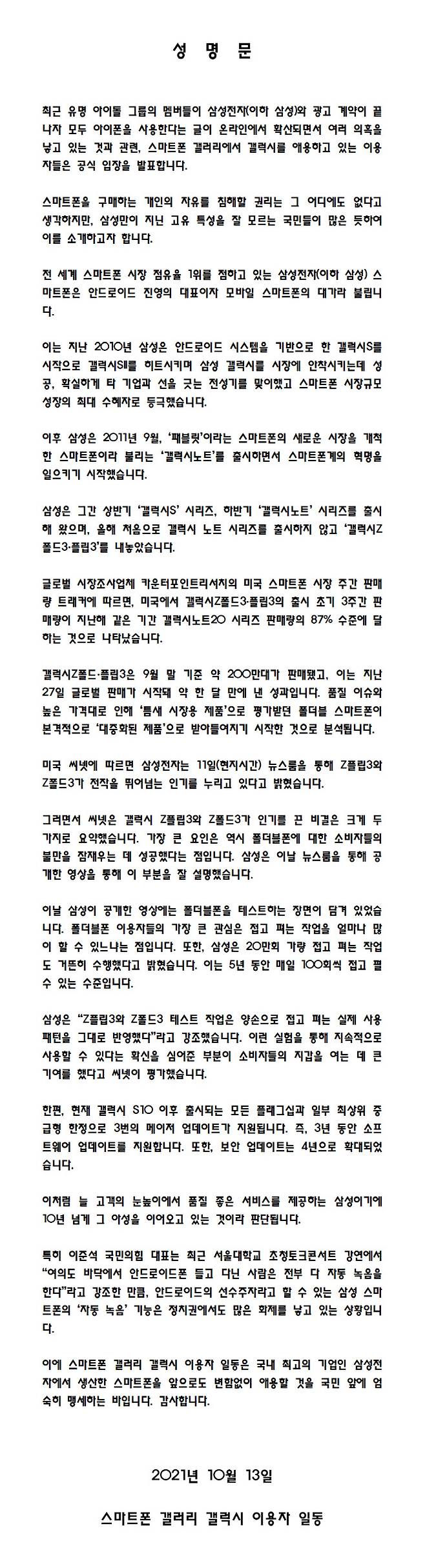 성명서에서는 “유명 아이돌 그룹 멤버들이 삼성전자와 광고 계약이 끝나자 모두 아이폰을 사용한다는 글이 온라인에서 확산되면서 의혹을 낳고 있는 것과 관련, 스마트폰 갤러리에서 갤럭시를 애용하고 있는 이용자들은 공식 입장을 발표한다”고 전제했다.