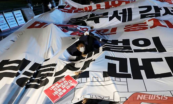 [서울=뉴시스] 조성우 기자 = 13일 오후 서울 종로구 보신각 앞에서 '무주택자 공동행동' 주최로 열린 '무주택자 집값 폭등 규탄 촛불집회' 참가자들이 부동산 적폐가 적힌 대형 현수막을 찢는 퍼포먼스를 하고 있다. 2021.10.13. xconfind@newsis.com