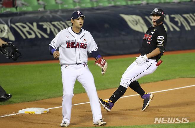 [서울=뉴시스] 고범준 기자 = 13일 오후 서울 송파구 잠실야구장에서 열린 2021 KBO리그 kt wiz와 두산 베어스의 경기, 3회초 무사 1루 kt 황재균이 1타점 3루타를 치고 베이스를 밟고 있다. 2021.10.13. bjko@newsis.com