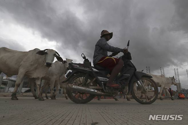 [프놈펜=AP/뉴시스] 13일 캄보디아 프놈펜 외곽 한 마을 인근에서 소의 꼴을 먹인 한 남성이 오토바이를 타고 소를 몰아 귀가하고 있다. 2021.10.13.