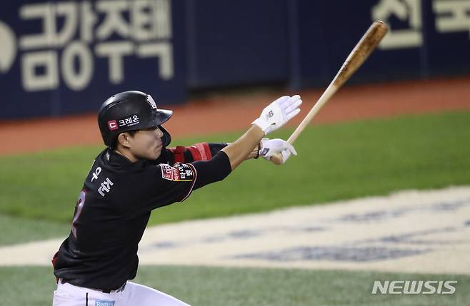 [서울=뉴시스] 고범준 기자 = 13일 오후 서울 송파구 잠실야구장에서 열린 2021 KBO리그 kt wiz와 두산 베어스의 경기, 4회초 1사 1루 kt 심우준이 안타를 치고 있다. 2021.10.13. bjko@newsis.com