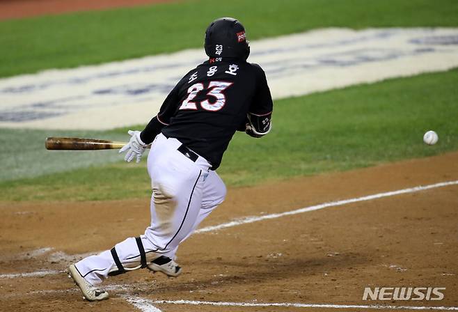 [서울=뉴시스] 고범준 기자 = 13일 오후 서울 송파구 잠실야구장에서 열린 2021 KBO리그 kt wiz와 두산 베어스의 경기, 4회초 1사 1,3루 kt 조용호가 번트를 치고 있다. 2021.10.13. bjko@newsis.com