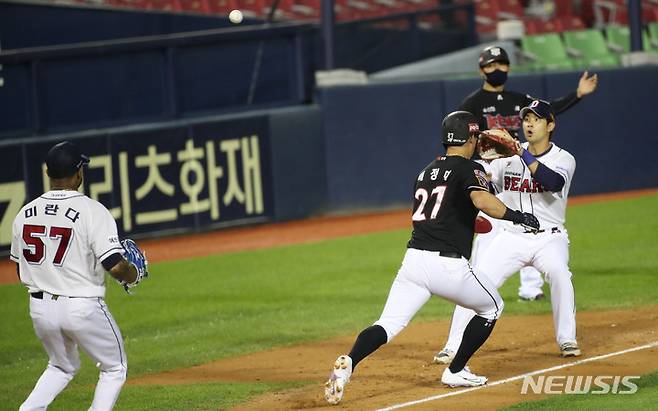 [서울=뉴시스] 고범준 기자 = 13일 오후 서울 송파구 잠실야구장에서 열린 2021 KBO리그 kt wiz와 두산 베어스의 경기, 4회초 1사 1,3루 kt 조용호의 내야 안타 때 3루주자 배정대가 태그아웃 당하고 있다. 2021.10.13. bjko@newsis.com