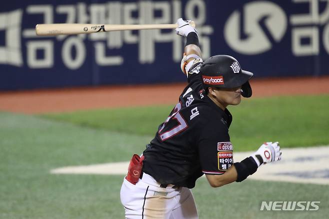 [서울=뉴시스] 고범준 기자 = 13일 오후 서울 송파구 잠실야구장에서 열린 2021 KBO리그 kt wiz와 두산 베어스의 경기, 6회초 2사 주자없는 상황 kt 배정대가 안타를 치고 있다. 2021.10.13. bjko@newsis.com