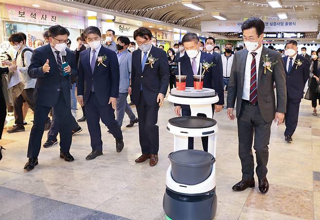 [서울=뉴시스] 이영환 기자 = 주영준 산업통상자원부 산업정책실장이 13일 오후 대전시 중앙로 지하상가에서 열린 AI·5G기반 서비스로봇 융합모델 실증사업 출범식에 참석해 서비스 로봇을 살펴보고 있다.이날 출범식에는 허태정 대전시장, 더불어민주당 황운하, 장철민 의원 등이 참석했다. (사진=산업통상자원부 제공) 2021.10.13. photo@newsis.com *재판매 및 DB 금지
