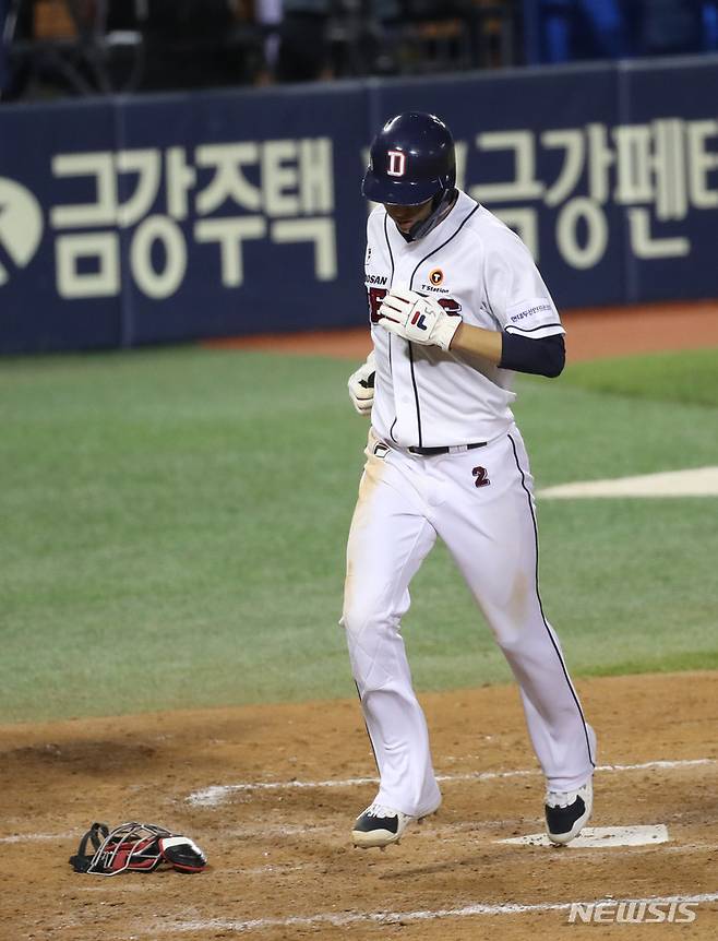 [서울=뉴시스] 고범준 기자 = 13일 오후 서울 송파구 잠실야구장에서 열린 2021 KBO리그 kt wiz와 두산 베어스의 경기, 8회말 1사 3루 두산 박계범 타석 때 3루주자 박지훈이 상대 폭투로 홈을 밟고 있다. 2021.10.13. bjko@newsis.com