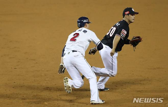 [서울=뉴시스] 고범준 기자 = 13일 오후 서울 송파구 잠실야구장에서 열린 2021 KBO리그 kt wiz와 두산 베어스의 경기, 8회말 무사 1루 두산 안재석 타석 때 1루주자 박지훈이 투수 견제 송구 실책으로 2루를 향하고 있다. 2021.10.13. bjko@newsis.com