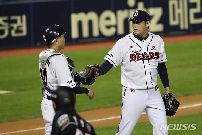 [서울=뉴시스] 고범준 기자 = 13일 오후 서울 송파구 잠실야구장에서 열린 2021 KBO리그 kt wiz와 두산 베어스의 경기, 5-3으로 승리를 거둔 두산 선수들이 하이파이브 하며 기뻐하고 있다. 2021.10.13. bjko@newsis.com