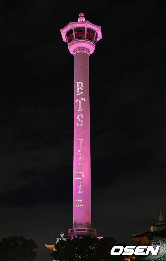 [OSEN=부산, 이대선 기자] 방탄소년단(BTS) 지민의 생일을 맞아 13일 오후 부산 중구 용두산공원 부산타워에서 특별 조명쇼가 펼쳐졌다.