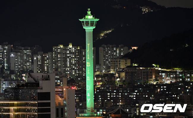 [OSEN=부산, 이대선 기자] 방탄소년단(BTS) 지민의 생일을 맞아 13일 오후 부산 중구 용두산공원 부산타워에서 특별 조명쇼가 펼쳐졌다.