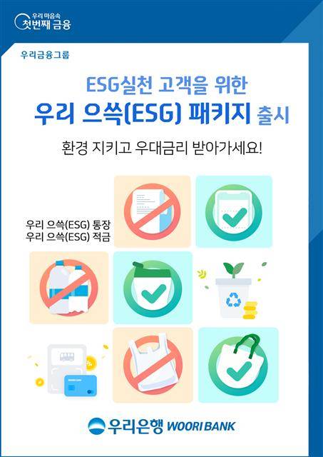 우리은행은 환경·사회·지배구조(ESG) 실천 고객에게 수수료 면제와 금리 우대 혜택을 제공하는 상품을 출시했다.
