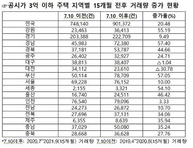 14일 국회 국토교통위원회 소속 더불어민주당 장경태 의원이 국토교통부와 한국부동산원이 제출한 공시가 3억원 미만 주택 거래를 분석한 결과 지난해 7·10 대책 발표 이후 지난 9월까지(계약일 기준) 공시가격 3억원 미만 주택이 총 90만1372건 거래됐다. 직전 15개월간인 2019년 4월~2020년 6월까지 매매거래 건수는 74만8140건이었다. 대책 발표 이후 15만3232건(20.5%) 증가한 것이다.